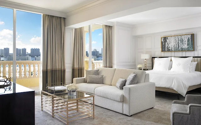 Las suites del hotel son todavía más impresionantes porque todas cuentan con vista al mar y están equipadas con una sala de estar independiente, sofá cama, sillón y mesas de centro.